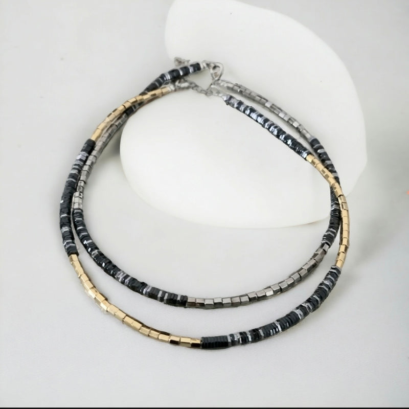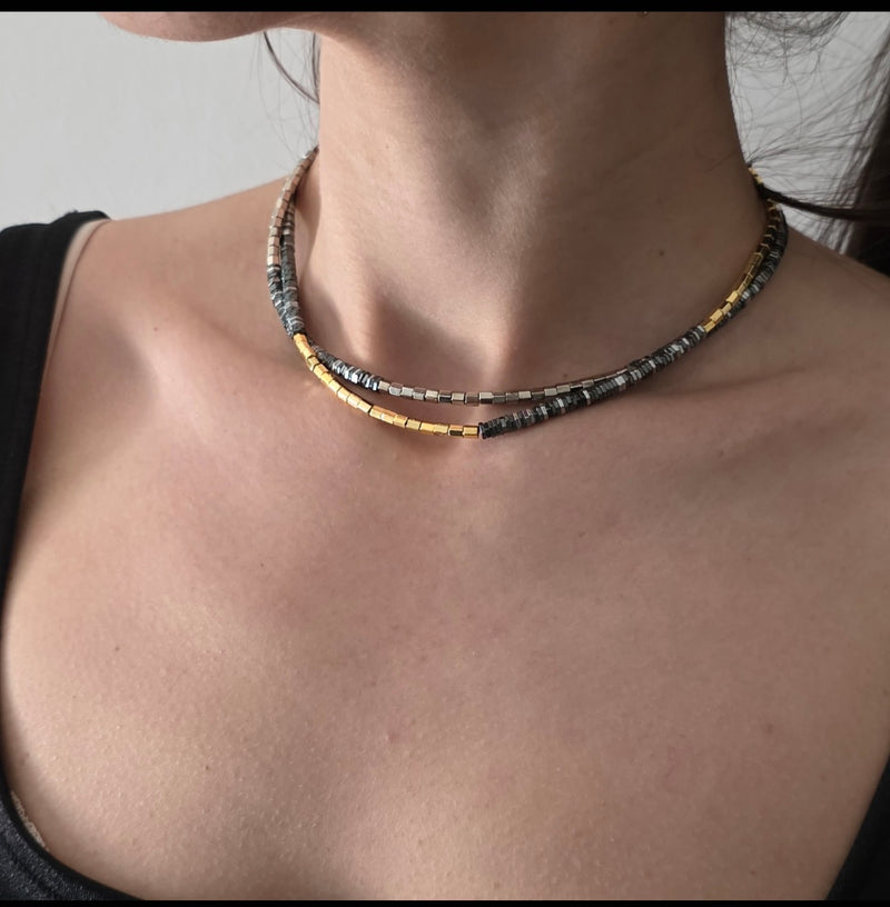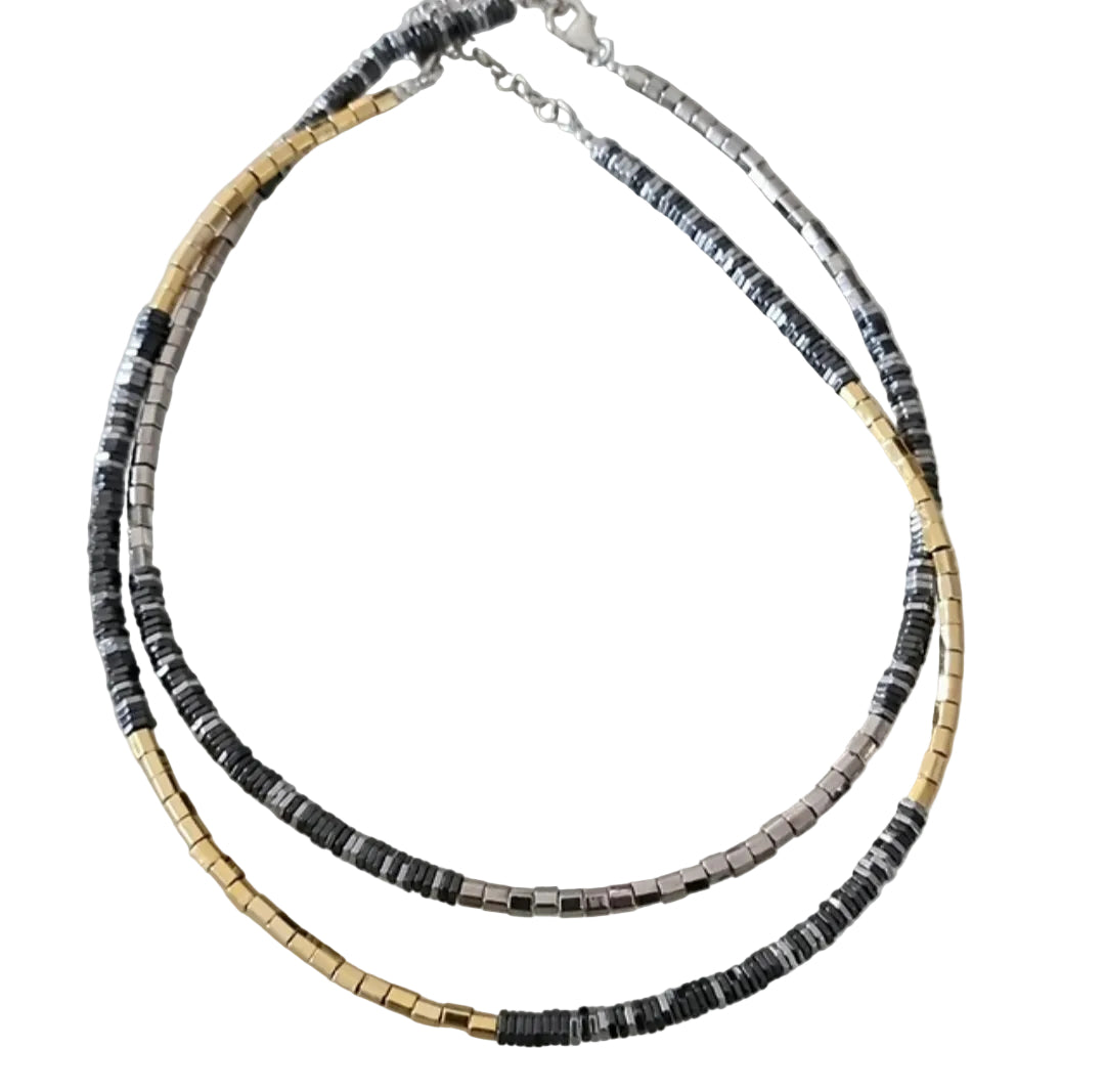 שרשרת המטייט זהב עם שילוב של אפור כהה מטלי, ושרשרת המטייט כסף, בשילוב של אפור כהה מטלי.( סוג של אפור כהה שחור).